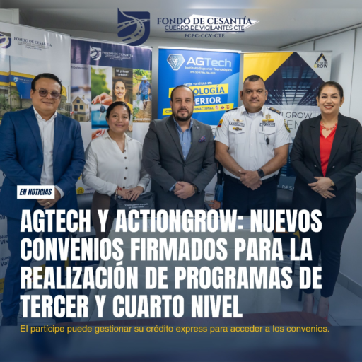 Con el objetivo de motivar los estudios de cientos de partícipes del Fondo de Cesantía de la CTE, la Coordinación de Comunicación ha gestionado junto a los representantes de AGTECH y ACTIONGROW dos convenios que ofrecen los programas técnicos, tecnológicos y las maestrías en especializaciones de Tránsito.