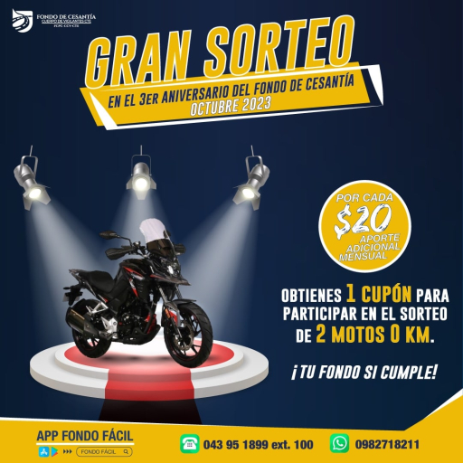 En su tercer aniversario y con el fin de incentivar el ahorro de nuestros partícipes, el FCPC-CCV-CTE sorteará 2 motos, bajo los siguientes términos y condiciones: